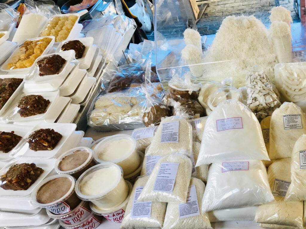 中でも最もポピュラーなのは食べ物です。食べ物のフェイラでは、野菜やフルーツ、卵やチーズ、肉や魚(場所によっては刺身も!)などの生鮮食品や、穀物、スパイス、キノコ類、食用植物プラント等と多岐に及ぶ種類の食品が並びます。